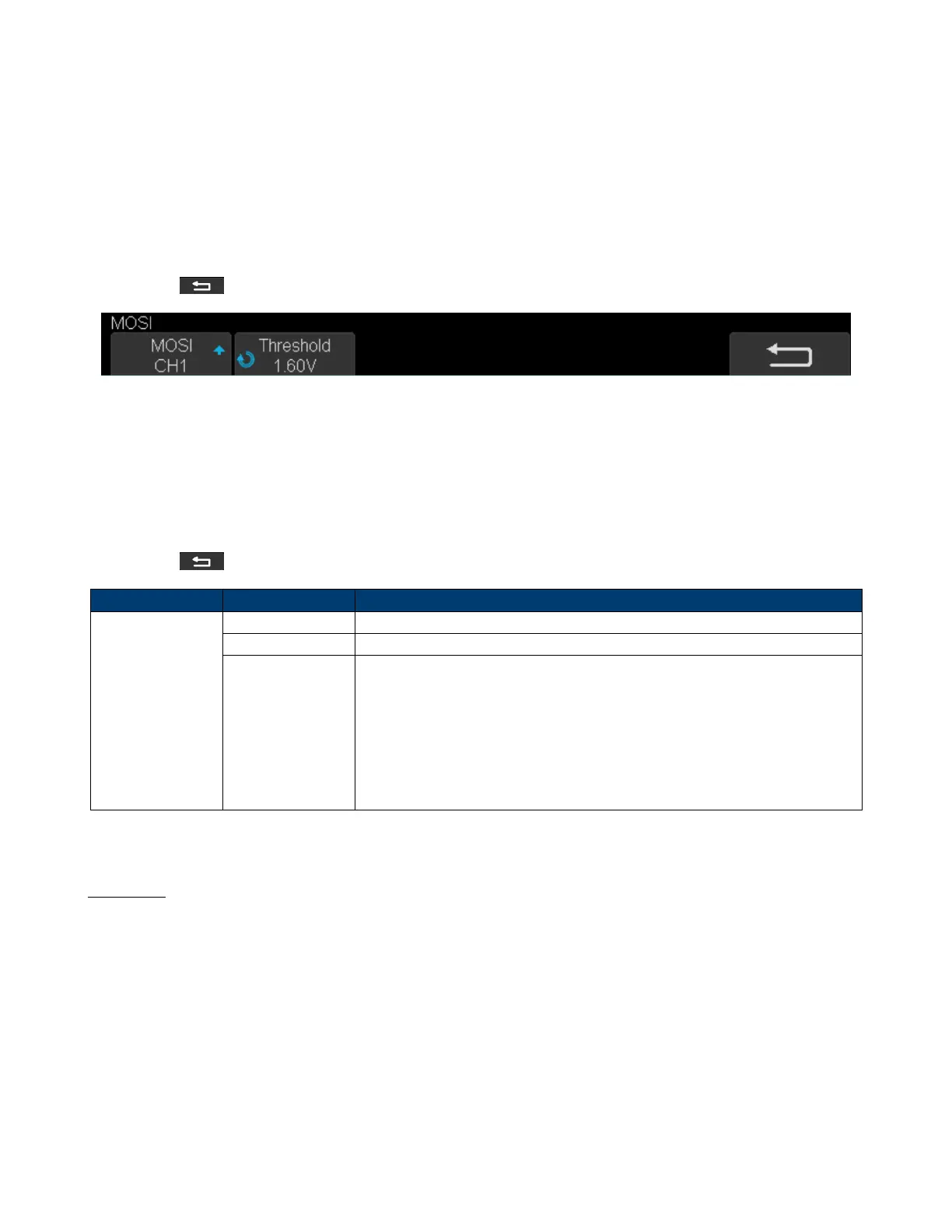 • Press the Threshold softkey, then use the Universal Knob to set the SPI MOSI signal’s threshold voltage level.
