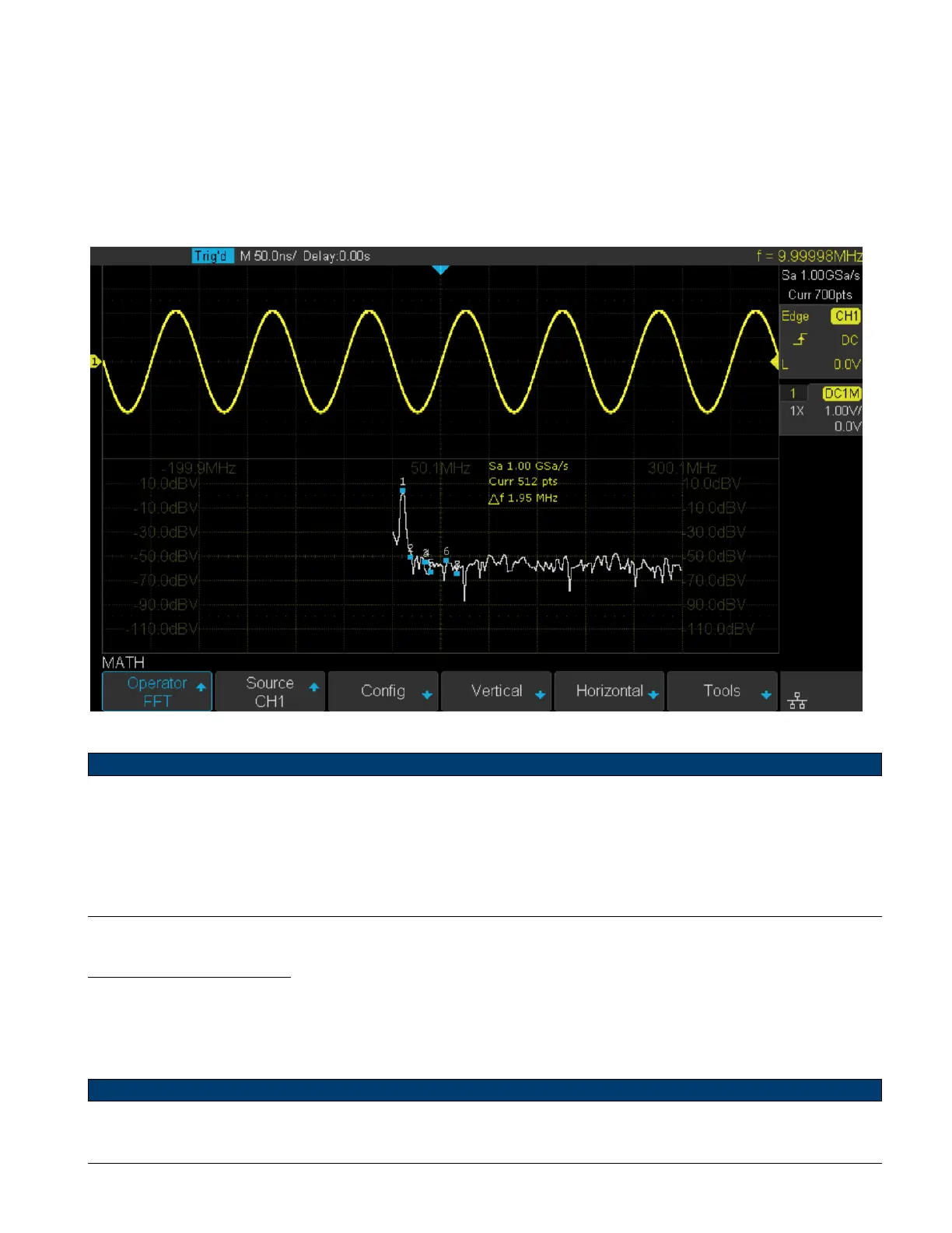 Figure 9.11 shows the FFT waveform displayed on the split screen and the peak tool is turned on: