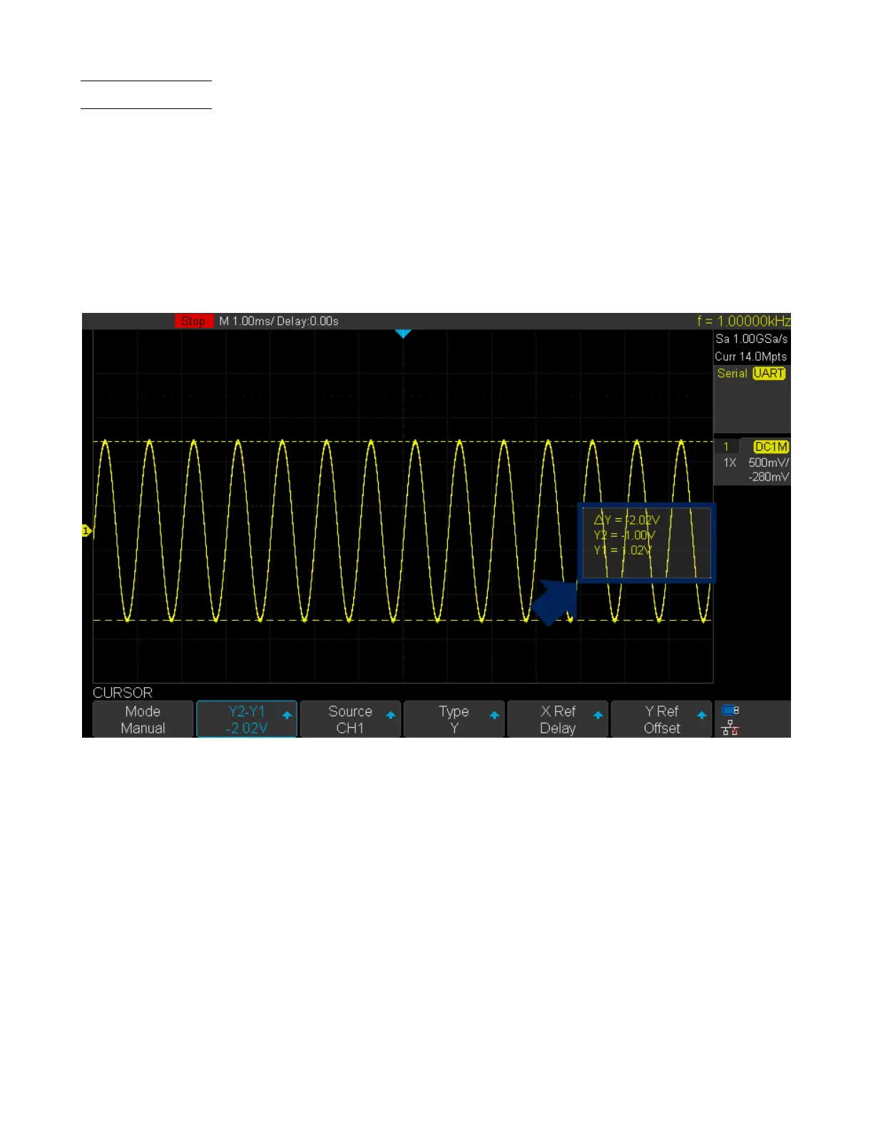 Use the Universal Knob to set the Y1 and Y2 cursor values and the values are displayed in the cursors box along with