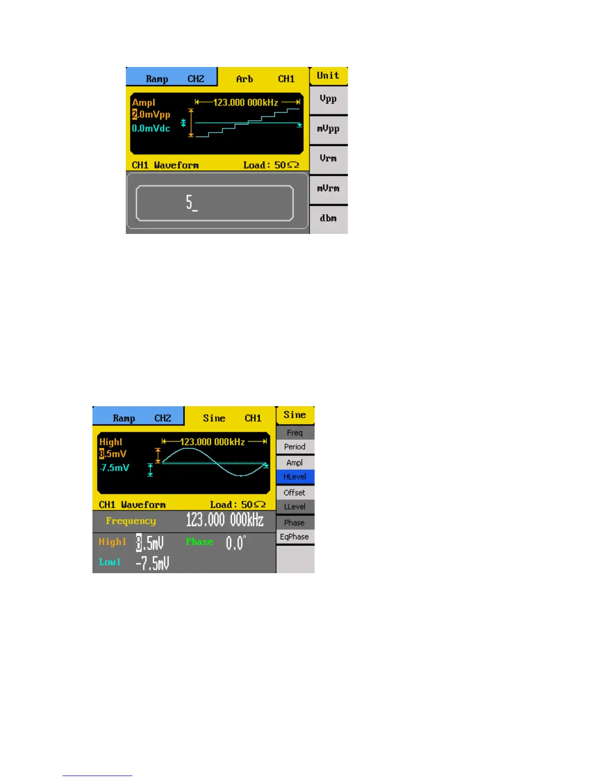 apply for the amplitude setting. Available units are: Vpp, mVpp, Vrm, mVrm, dbm.