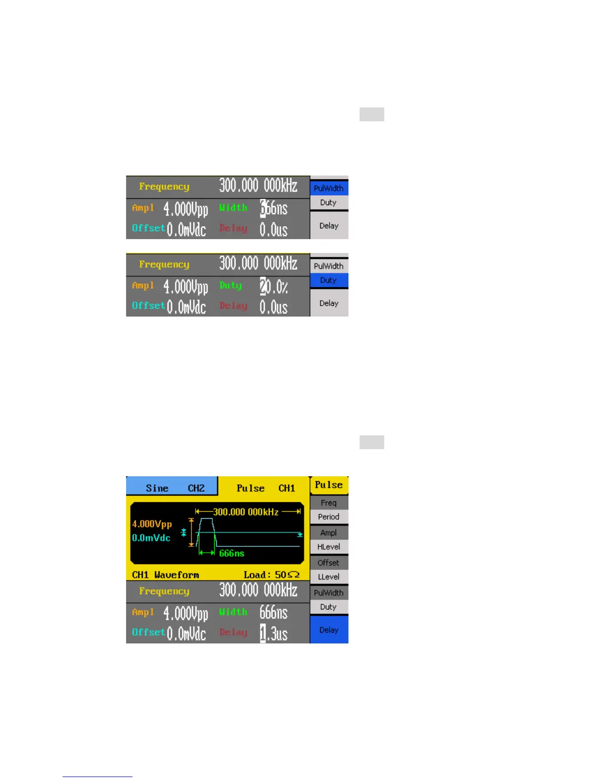 2. From the menu, select PulWidth for pulse width adjustment or Duty for duty cycle
