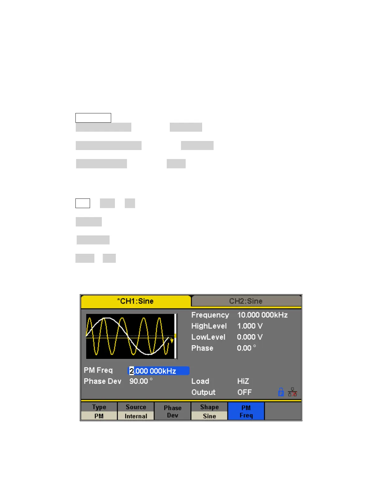 2. Press PM Freq, input ‘2’ from the keyboard and choose the unit ‘kHz’ to set the PM Freq to