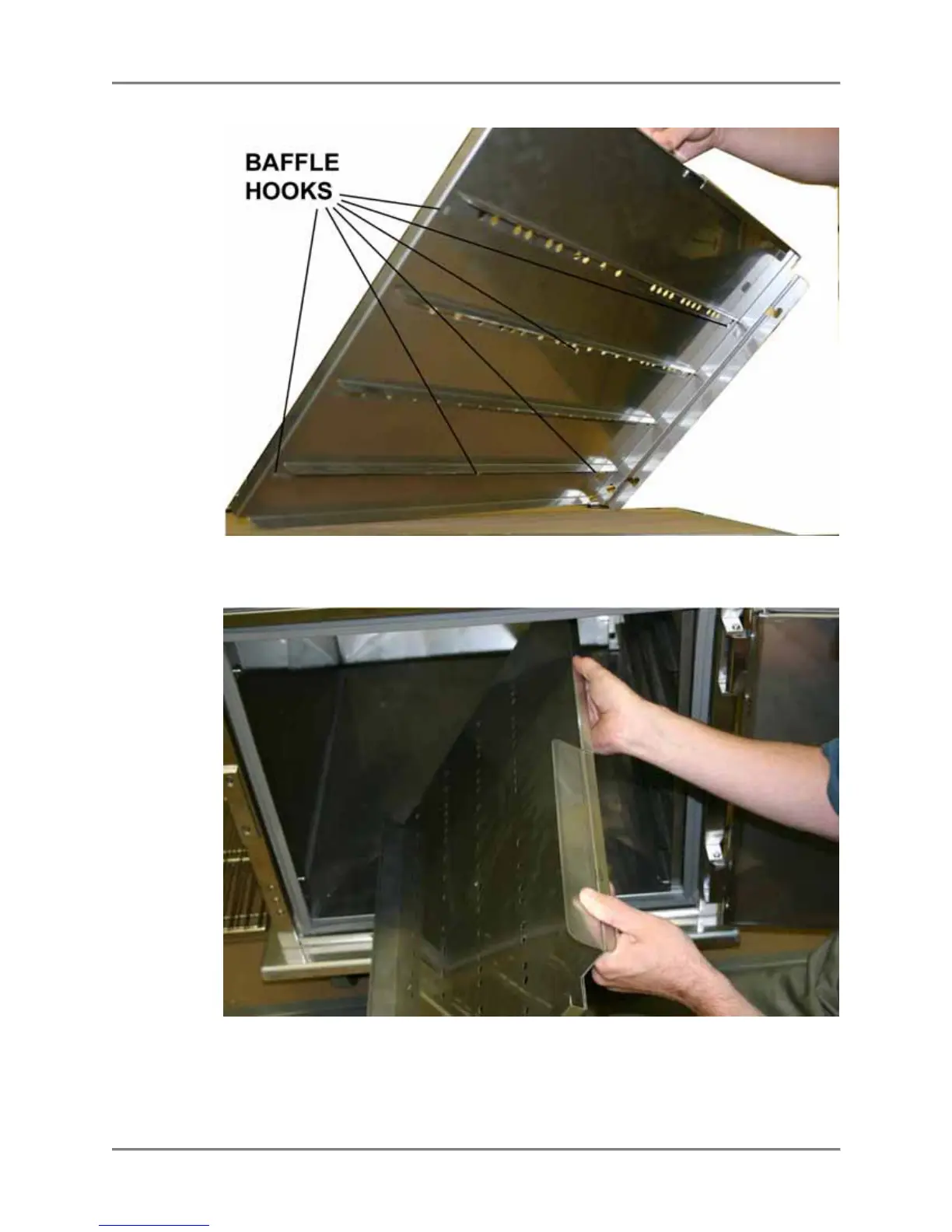 c. While holding the top of the baffle and the rack support together (keeping hooks from