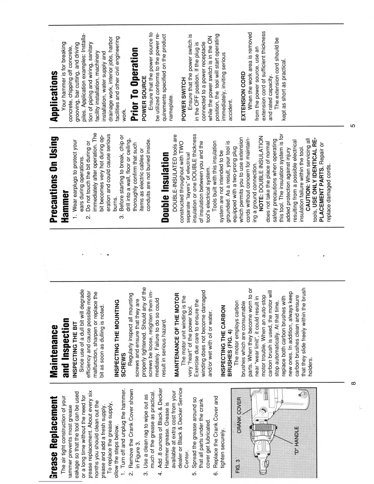 Black & Decker 5021 - Grease Replacement; Maintenance and Inspection; Precautions on Using Hammer; Double Insulation
