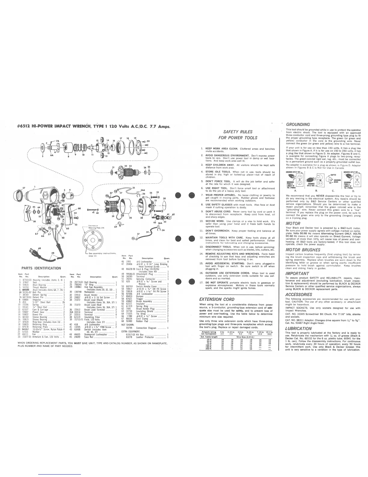Black & Decker 6512 - Safety Rules For Power Tools; Parts Identification; Grounding; Motor Brushes