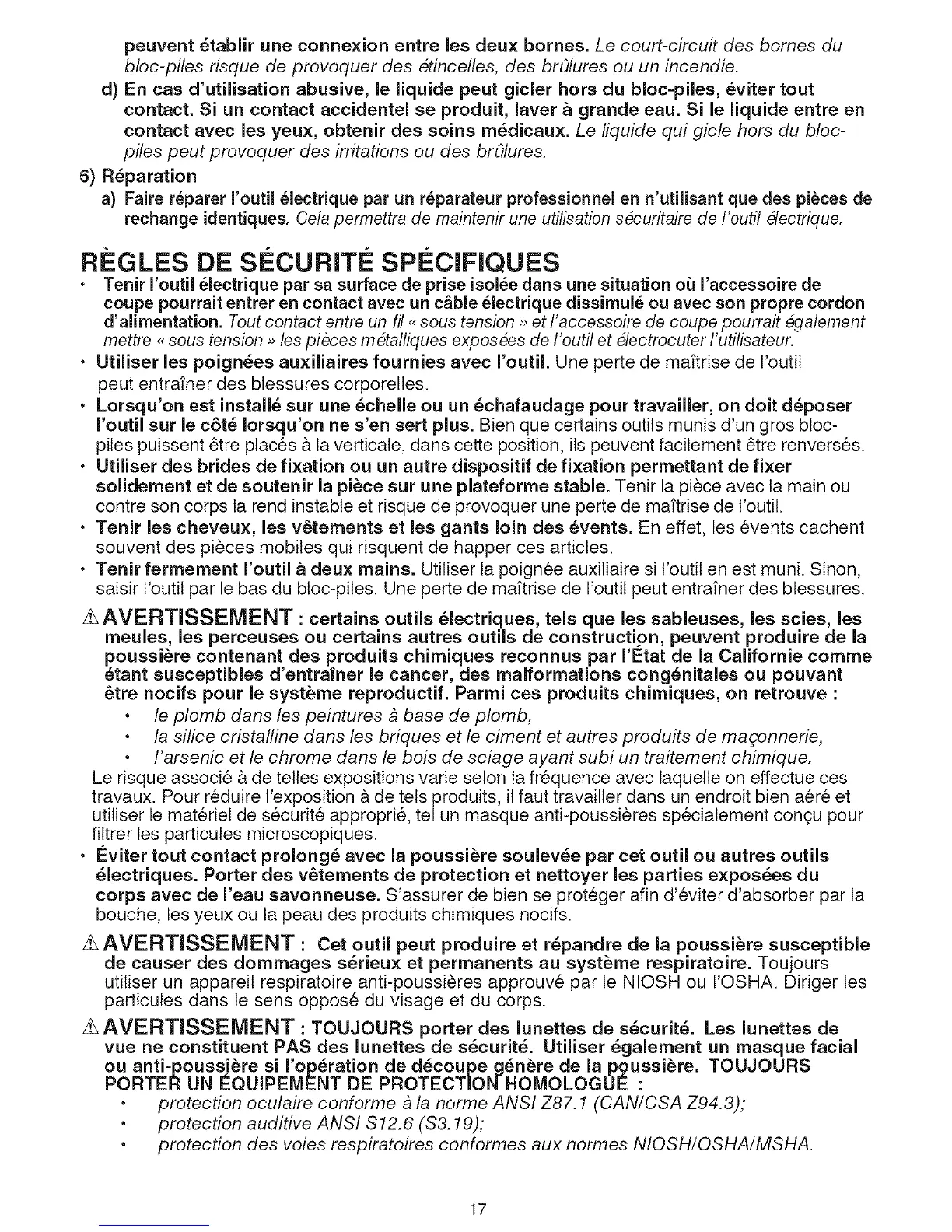 protection oculaire conforme a la norme ANSI Z87.1 (CAN/CSA Z94.3);