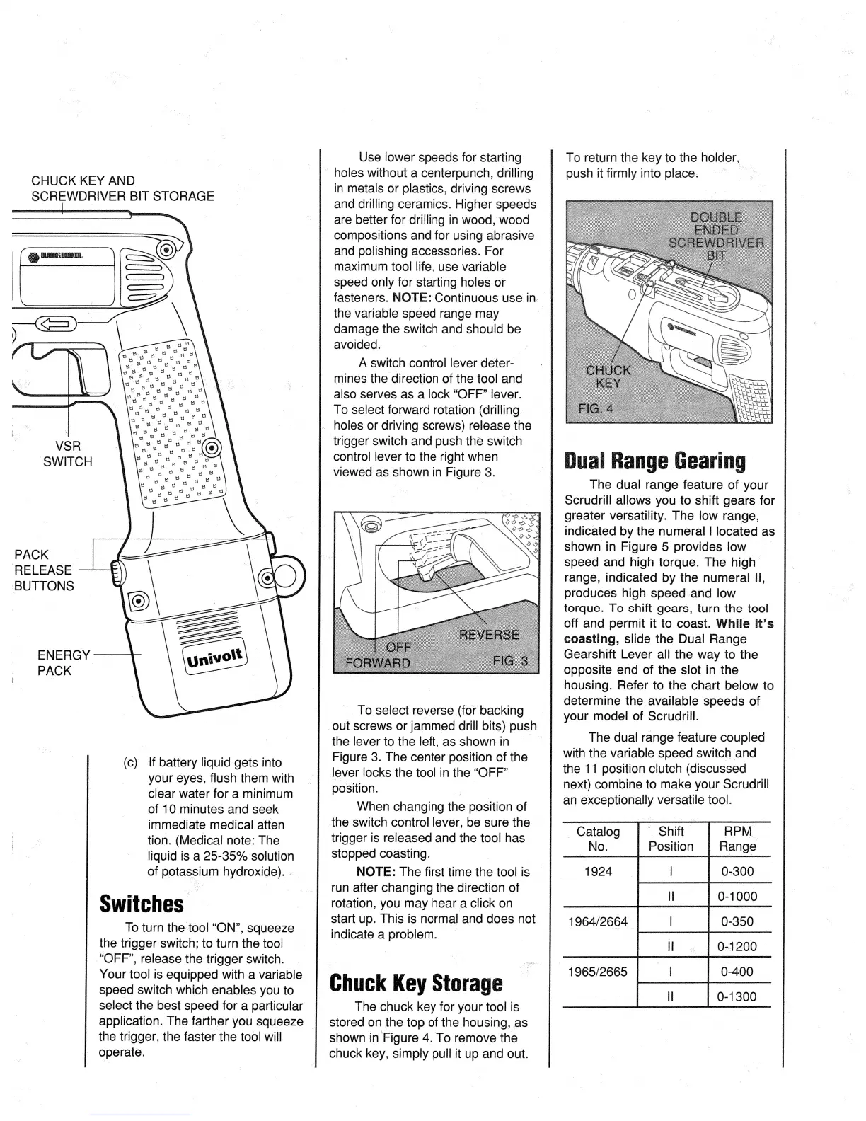 Black & Decker Cyclone - Tool Operation Controls; Trigger, Variable Speed, and Direction Switches; Chuck Key Storage; Accessing and Storing the Chuck Key