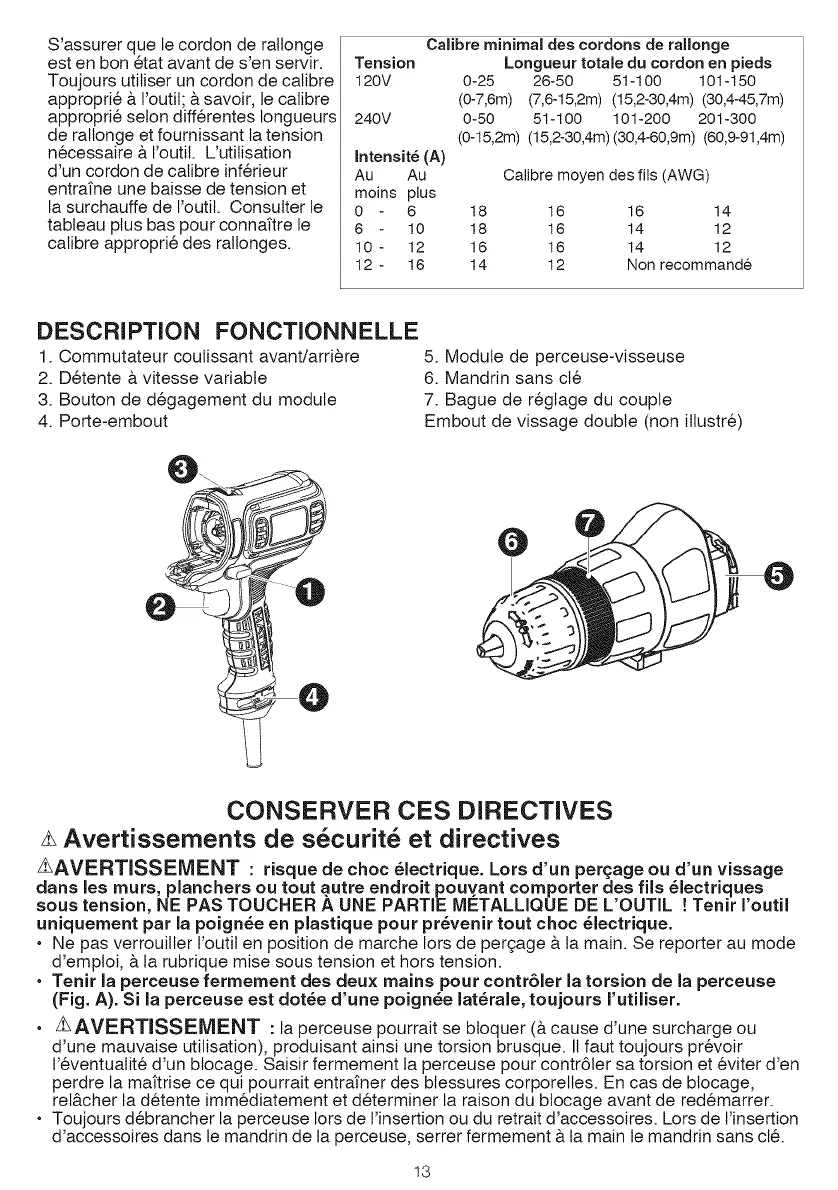 • ZLAVERTISSEMENT : la perceuse pourrait se btoquer (& cause d'une surcharge ou