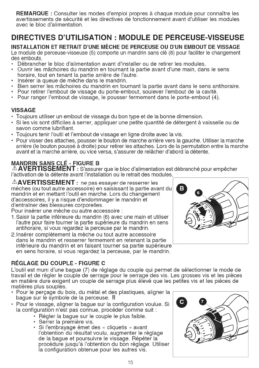 DIRECTIVES D'UTILISATION • MODULE DE PERCEUSE-VISSEUSE