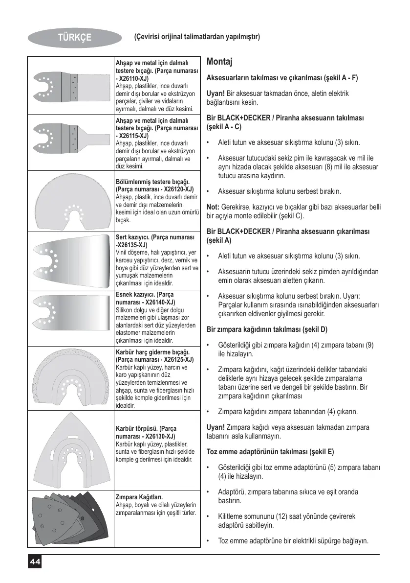 Not: Gerekirse, kazıyıcı ve bıçaklar gibi bazı aksesuarlar belli