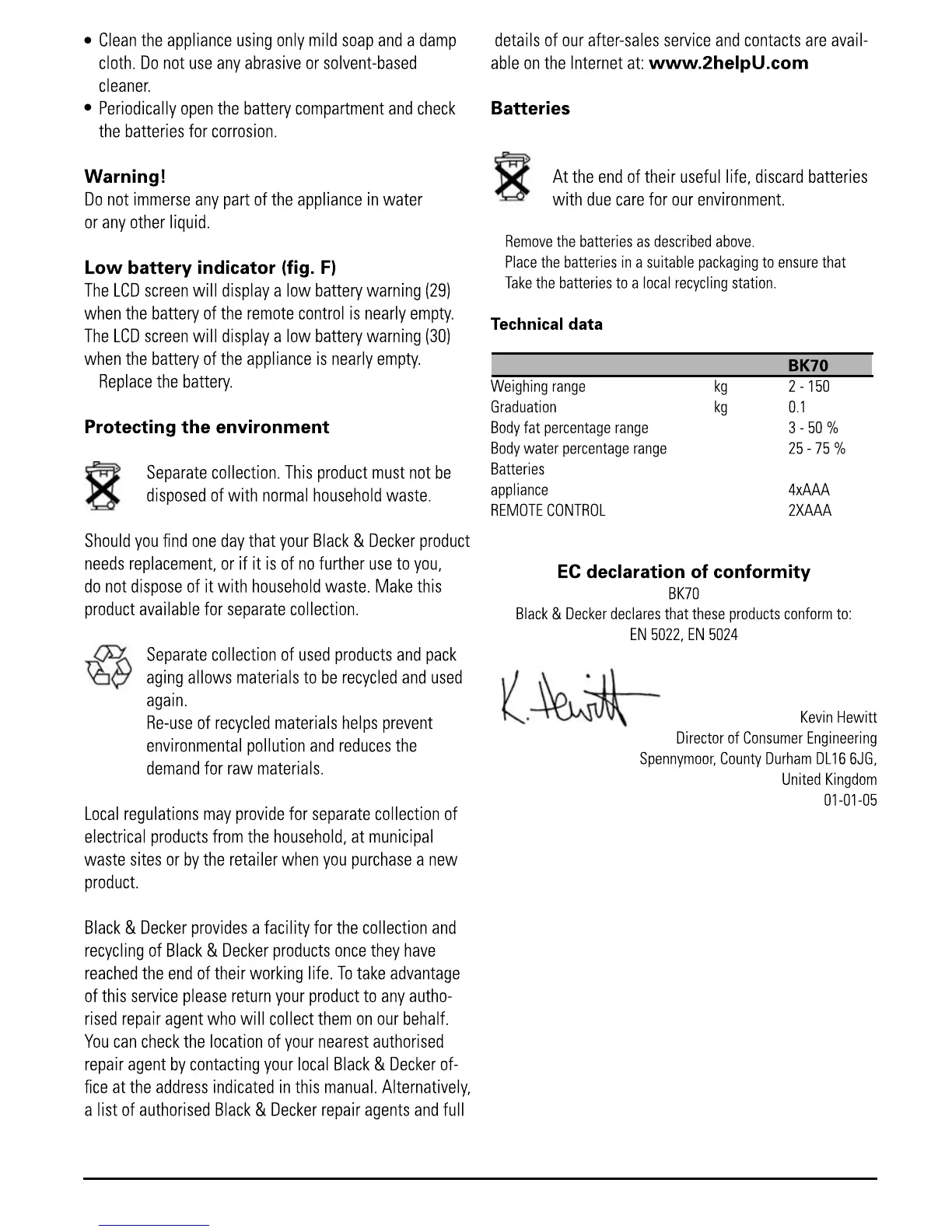 Black & Decker Scale - Low Battery Indicator; Protecting the Environment; Batteries; Technical Data