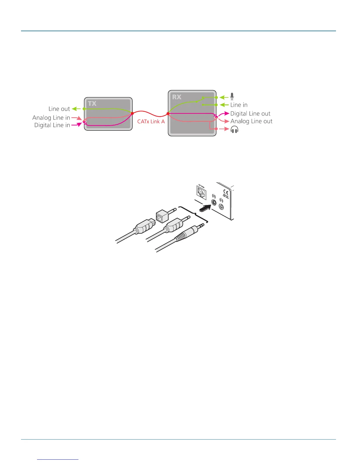 supported through 3.5mm jacks on the transmitter and receiver units: Line In/Out on the transmitter; Line In/Out plus