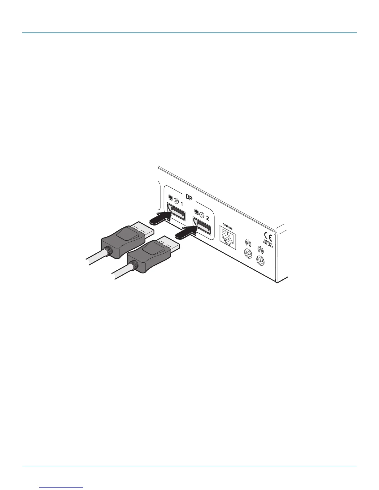 1 Use the supplied DisplayPort video cable to link DP port 1 on the rear panel of the transmitter unit with the primary video out-