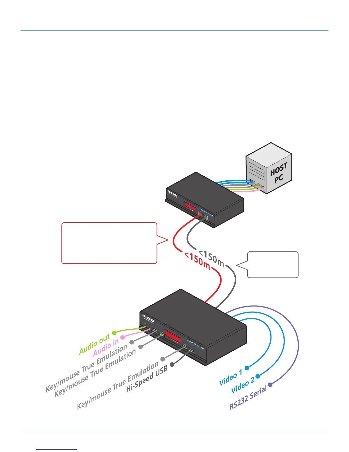 Using either one or two CATx cable links you can achieve separation distances of up to 150 meters/492 feet between the trans-