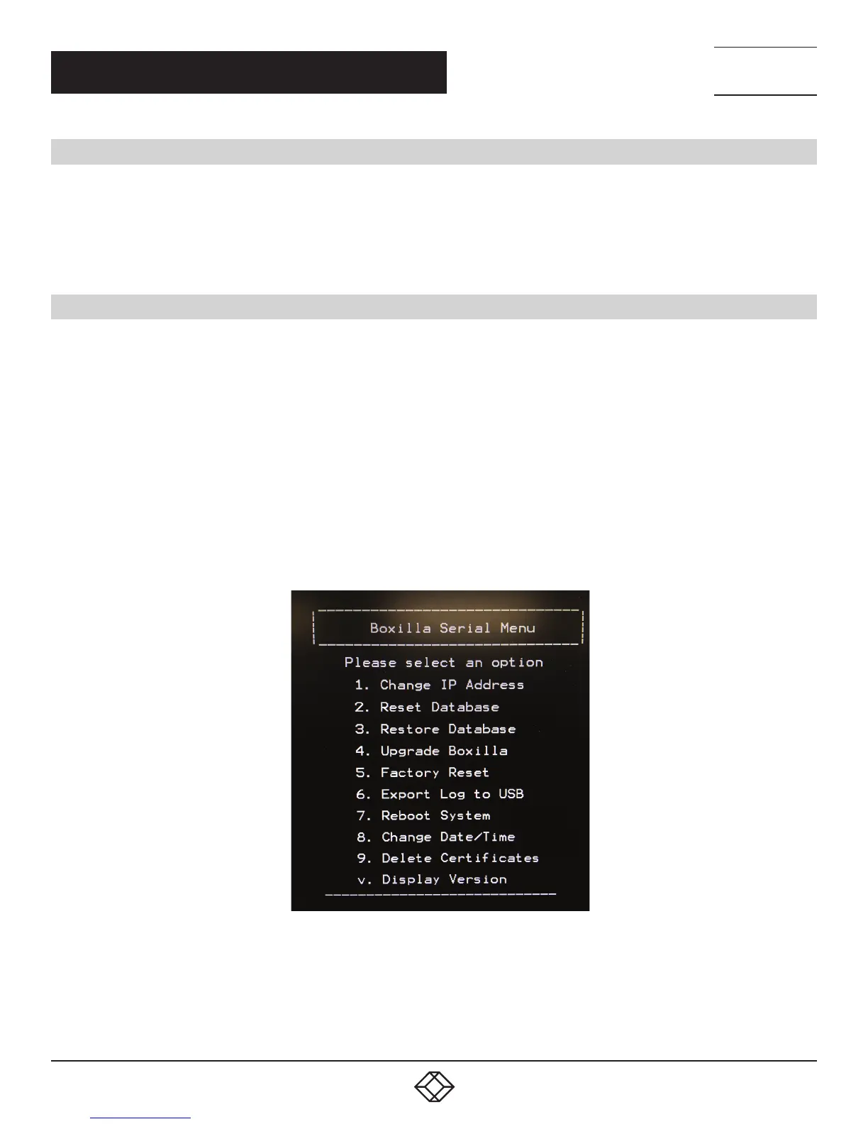 Once the connecting PC has the correct configuration, the following menu should appear when connected to Boxilla’s serial port.