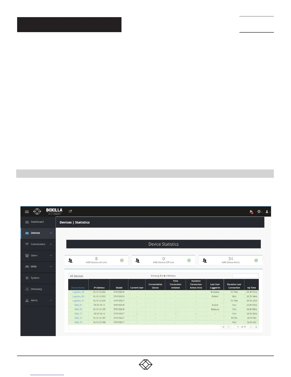 overview of the device on-line and off-line (not contactable). Then a table of devices is displayed showing what user is logged in to