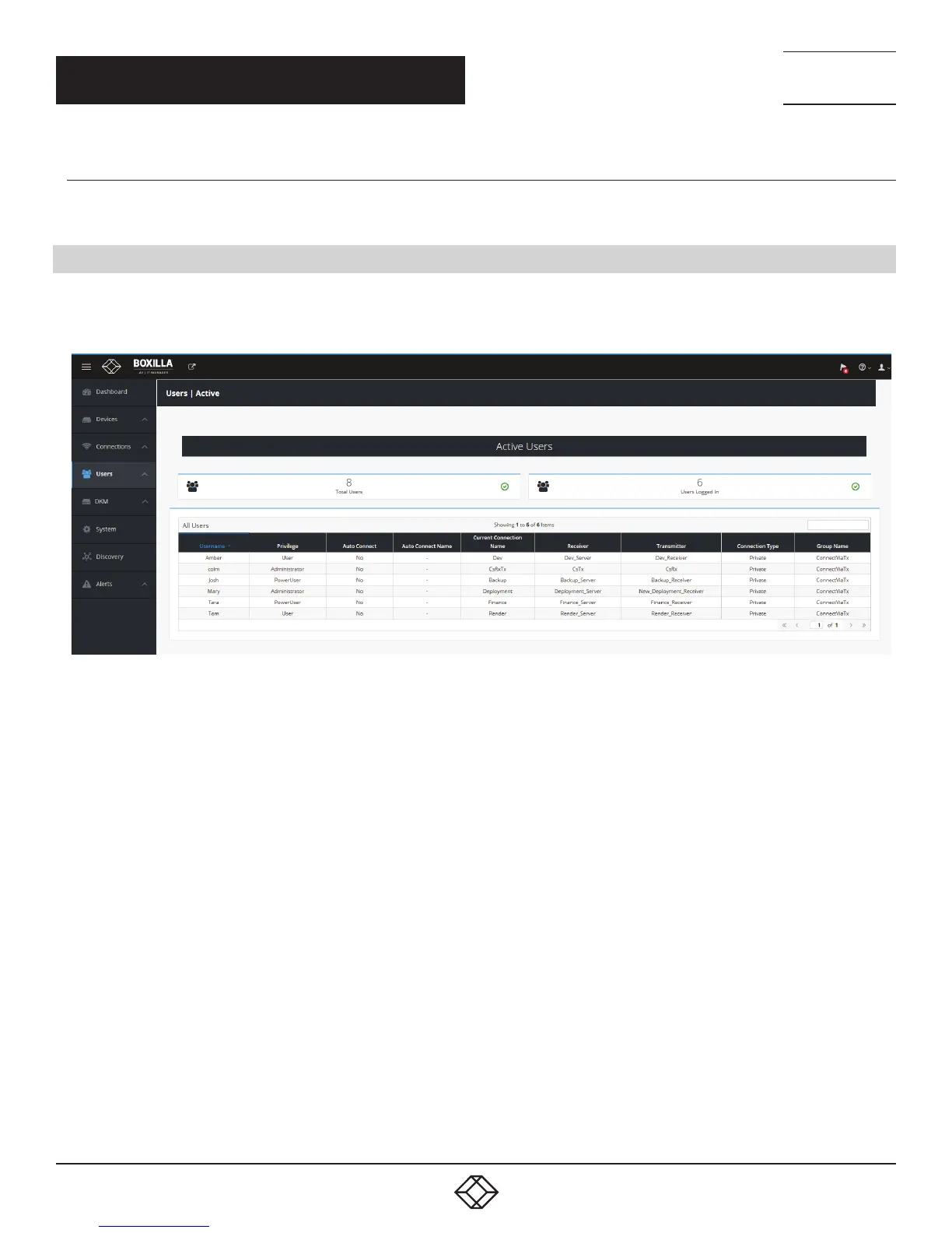 The User—Active page shows a list of all the users logged in to an Emerald or InvisaPC Receiver. The page provides information on