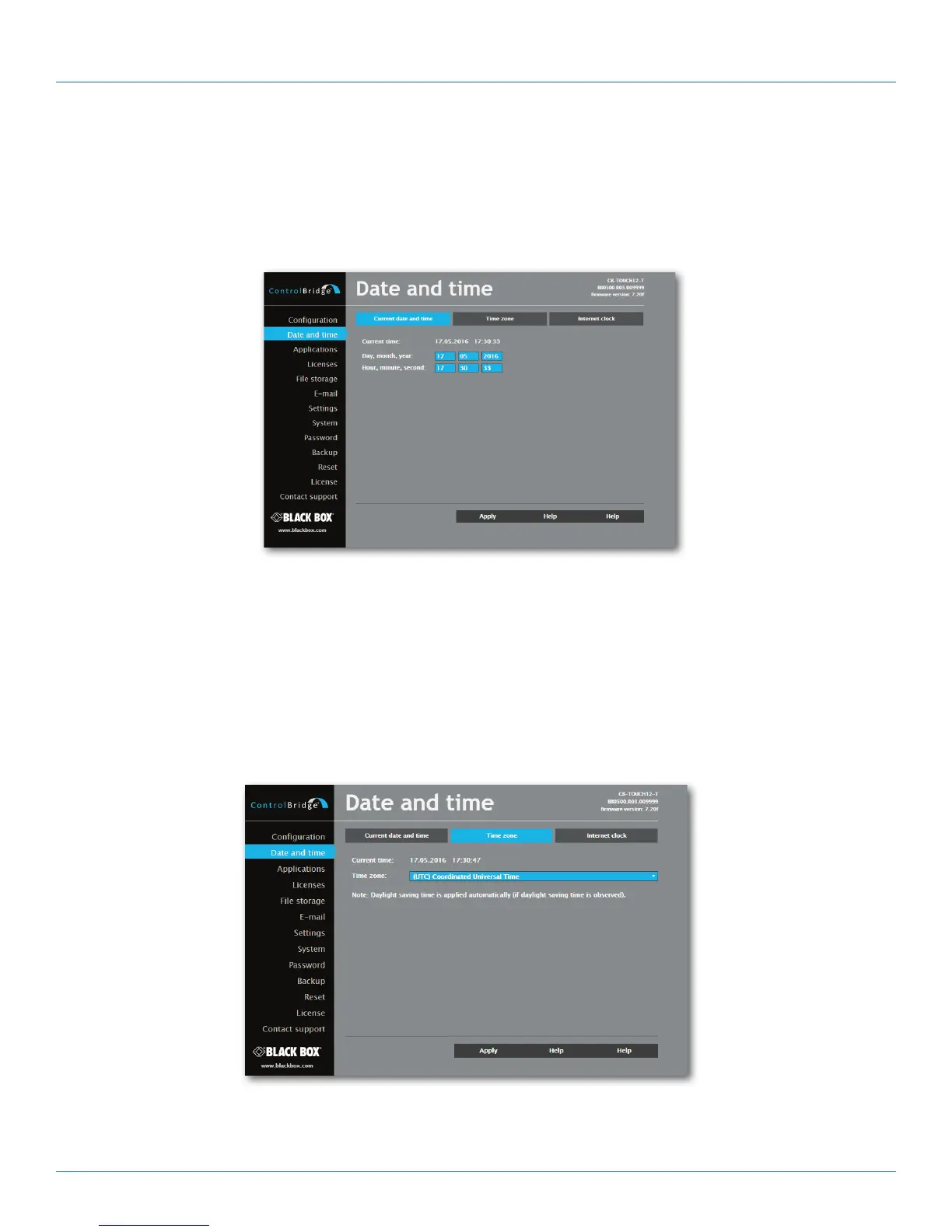 Use this page to set the time clock on your ControlBridge Unit. The current date, time, and time zone are shown on the
