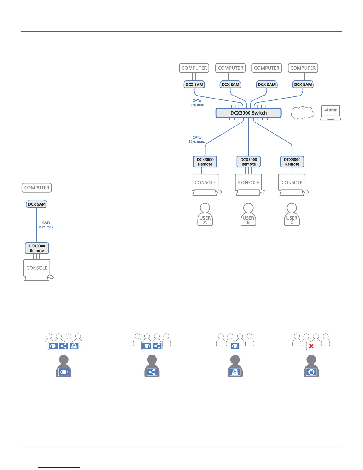dard CAT7 cable, to a central DCX3000 Switch. Each user