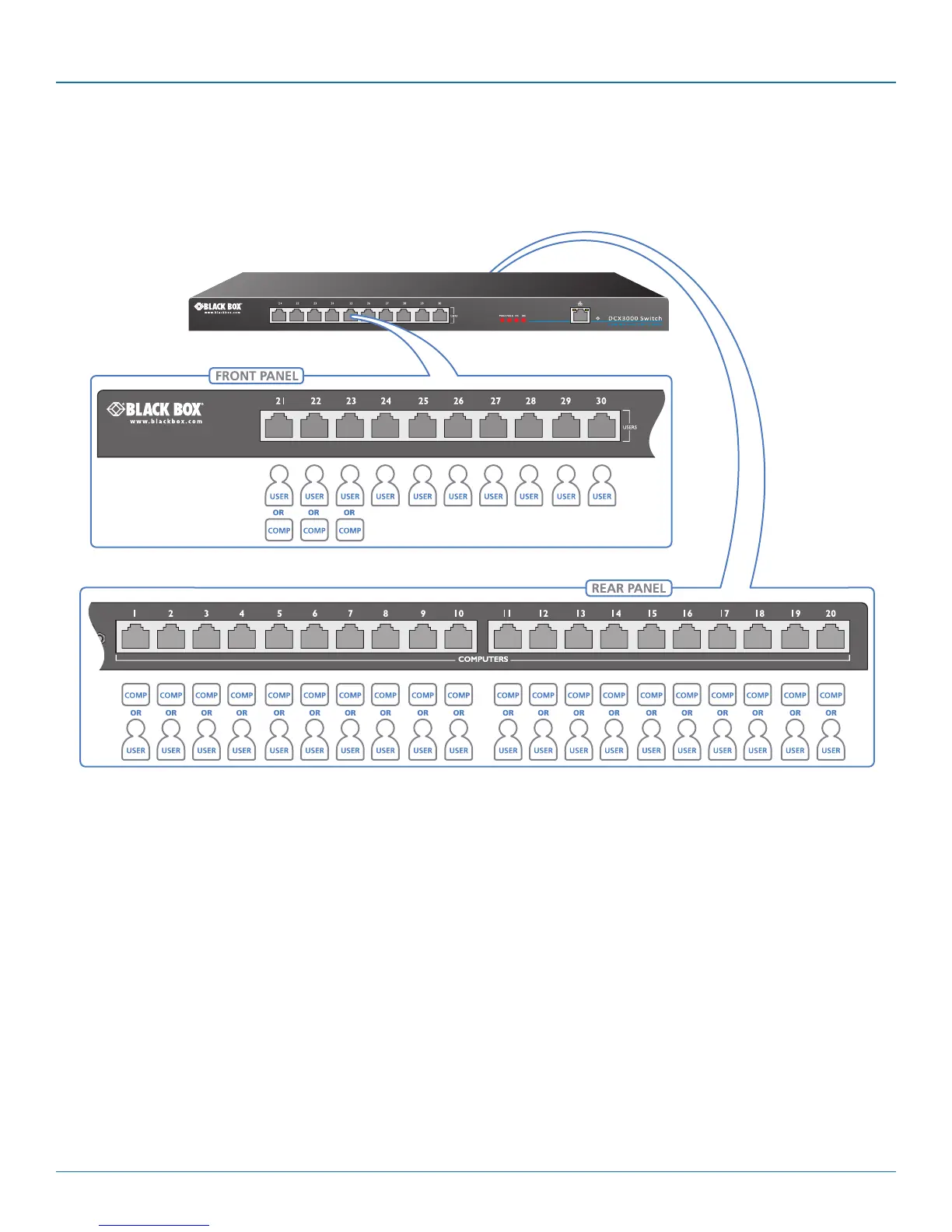 By default the DCX3000 Switch provides 10 user console ports on its front panel and 20 computer ports along its rear panel,