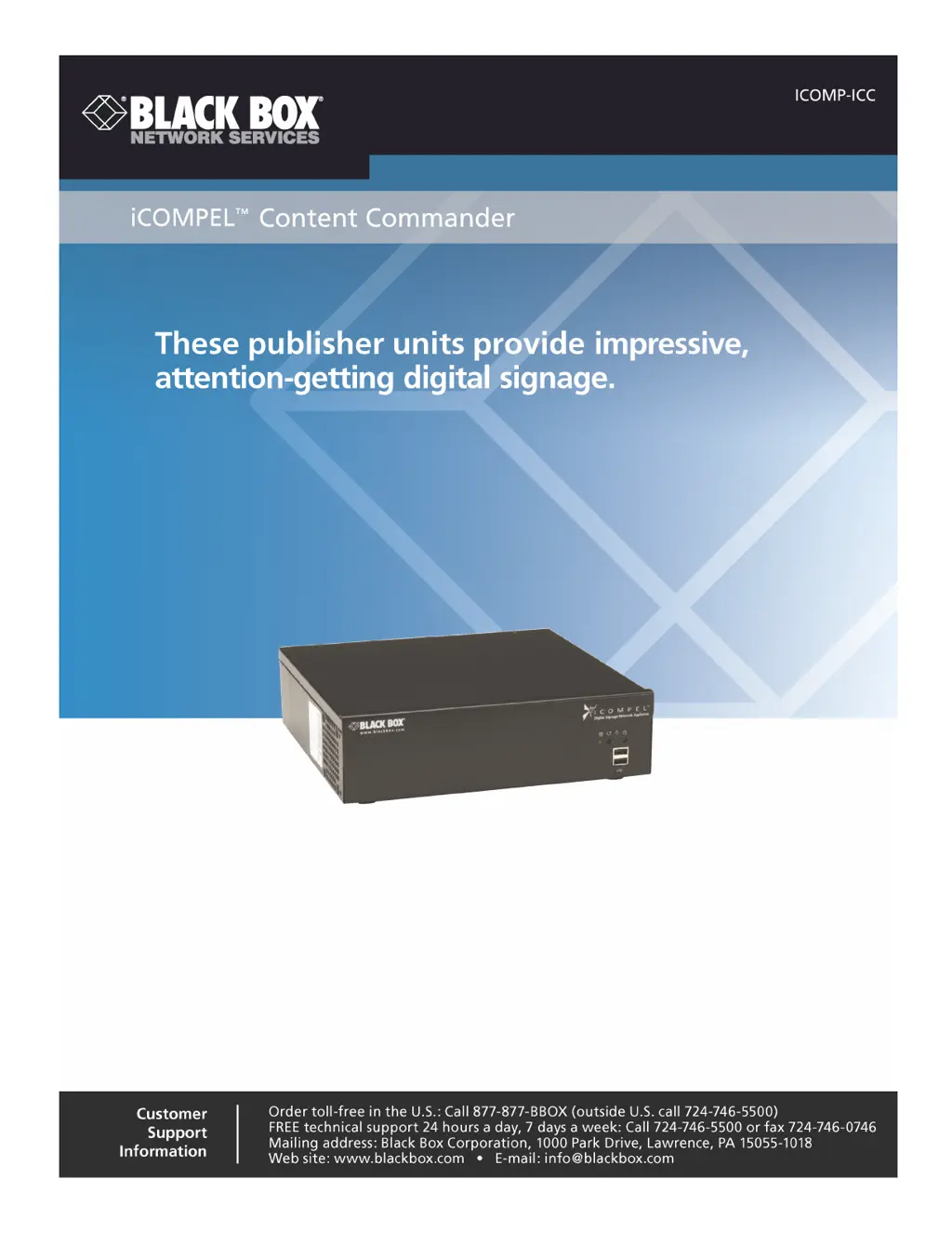 To ensure your browser isn't displaying a cached version of the Black Box Digital Signage iCC home page, in Internet Explorer, click 'File' and select 'Work offline'. Then, select 'Tools > Internet Options', click the button in the 'Browsing History' panel, and press F5.