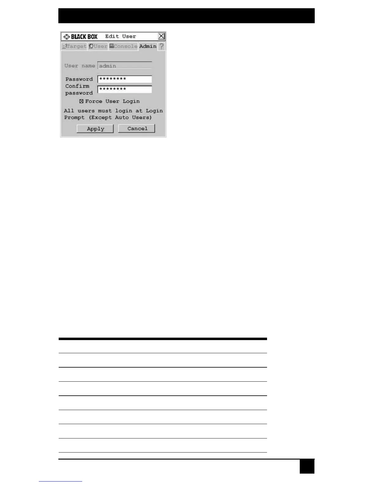7. To save changes and return to the User Admin screen, click Apply. To exit the OSD,