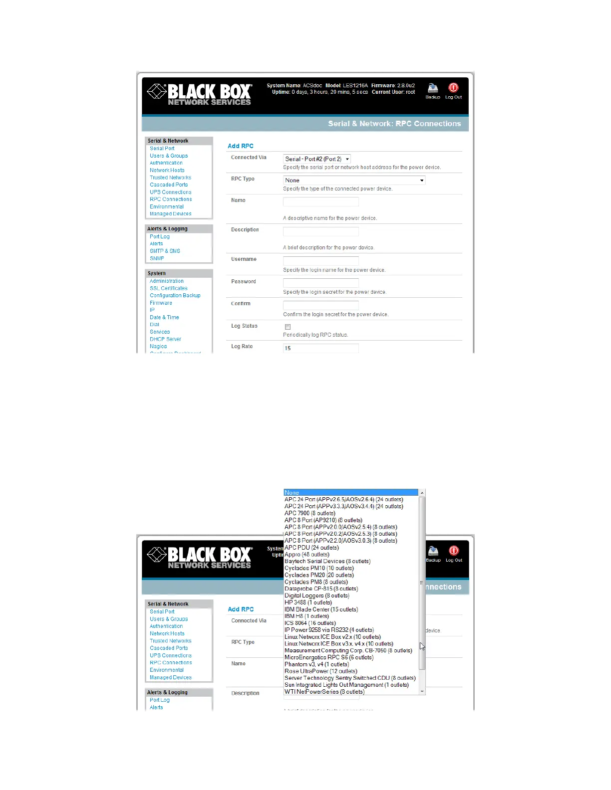 RPC types currently supported by the embedded PowerMan and the Black Box power