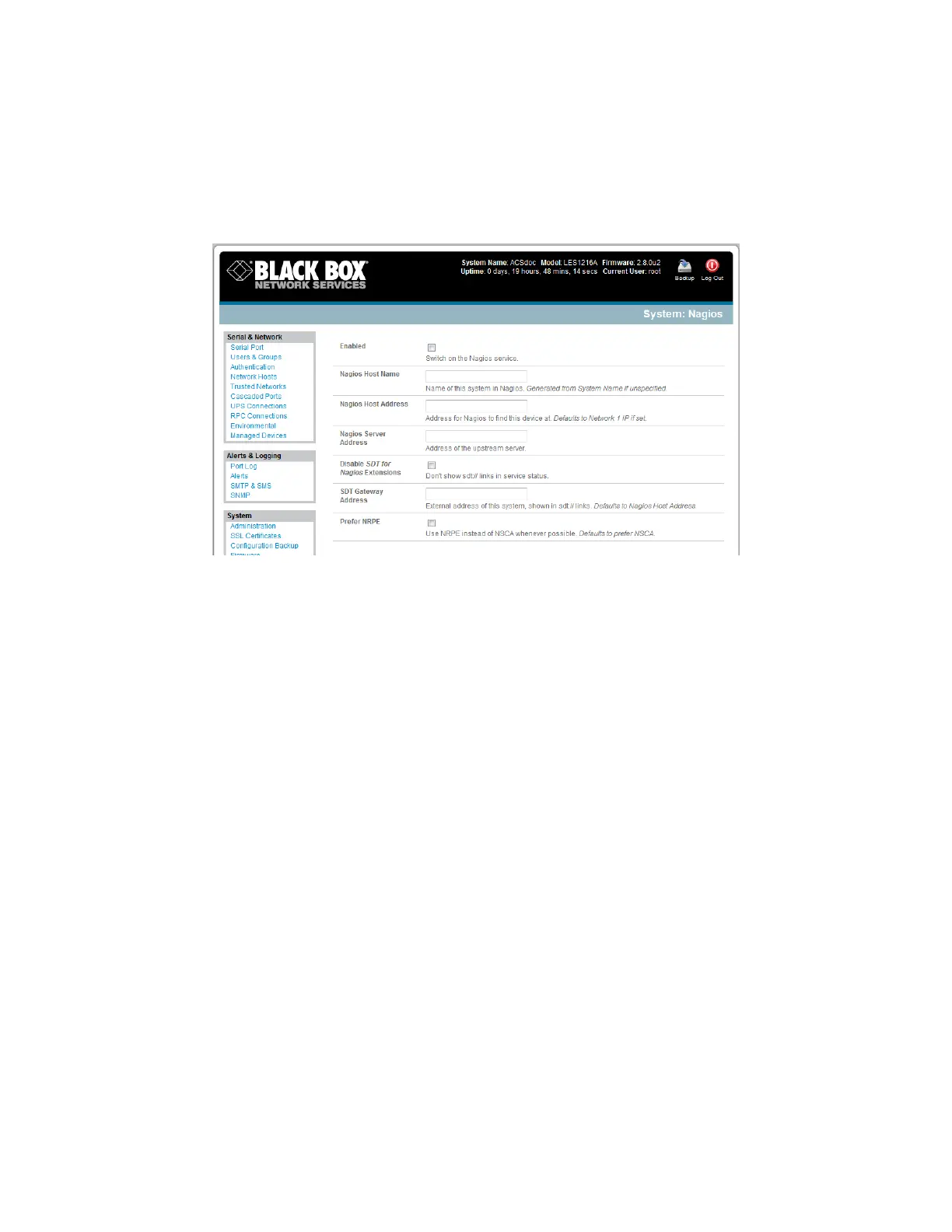 Browse the Black Box console server and select System: Nagios on the console server