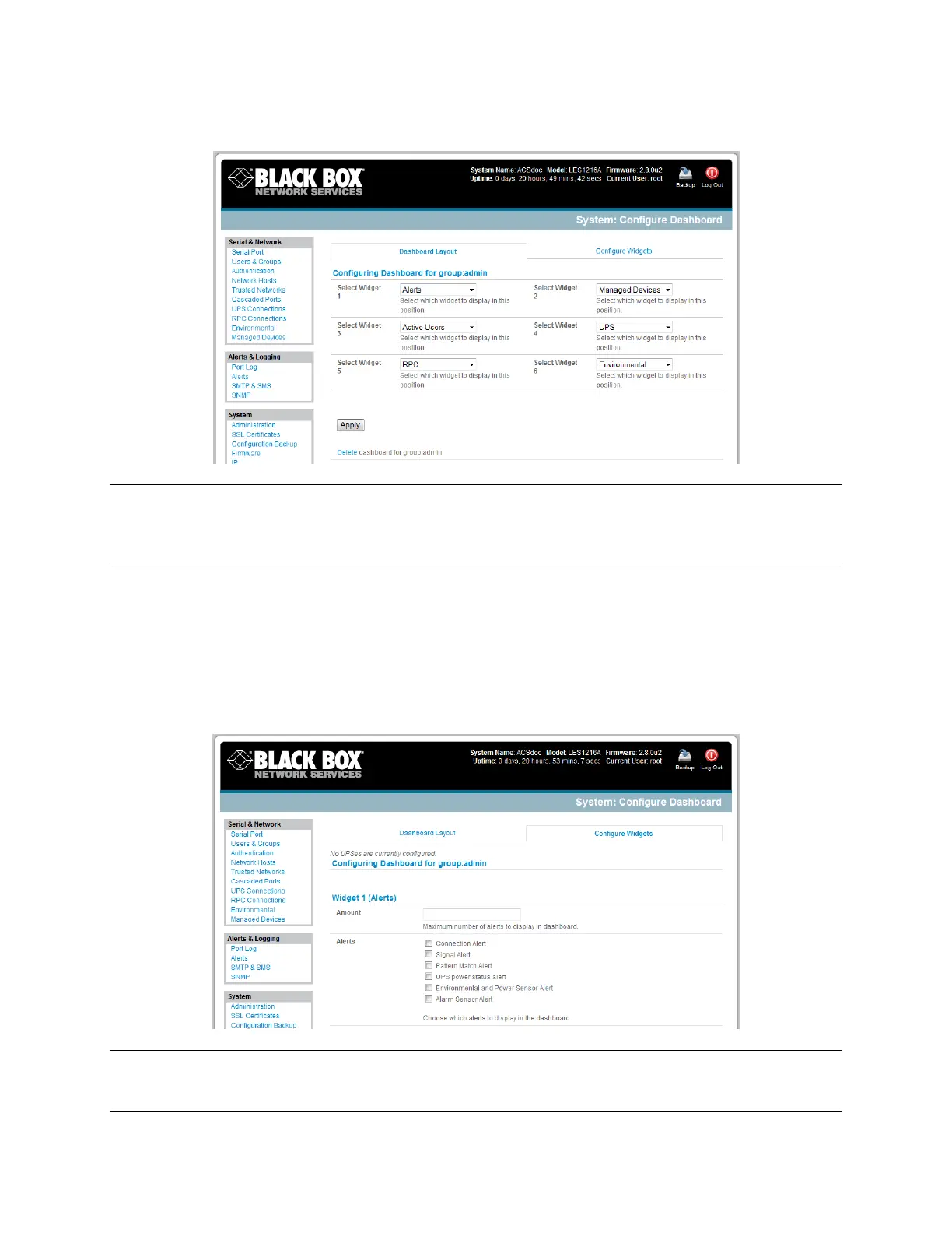 Note: Dashboard configuration is stored in the /etc/config/config.xml file. Each configured dashboard