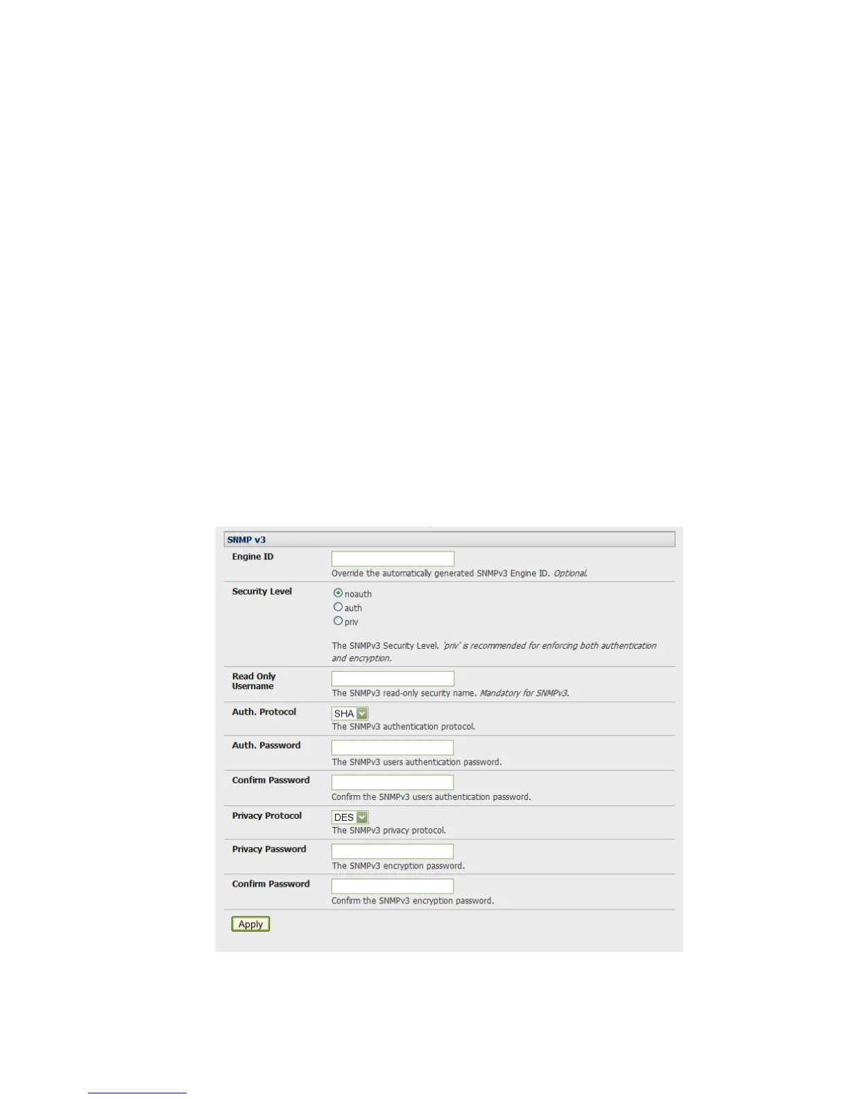 o For a Security Level of priv, select the Privacy Protocol (DES or AES) and the Privacy Password. AES is