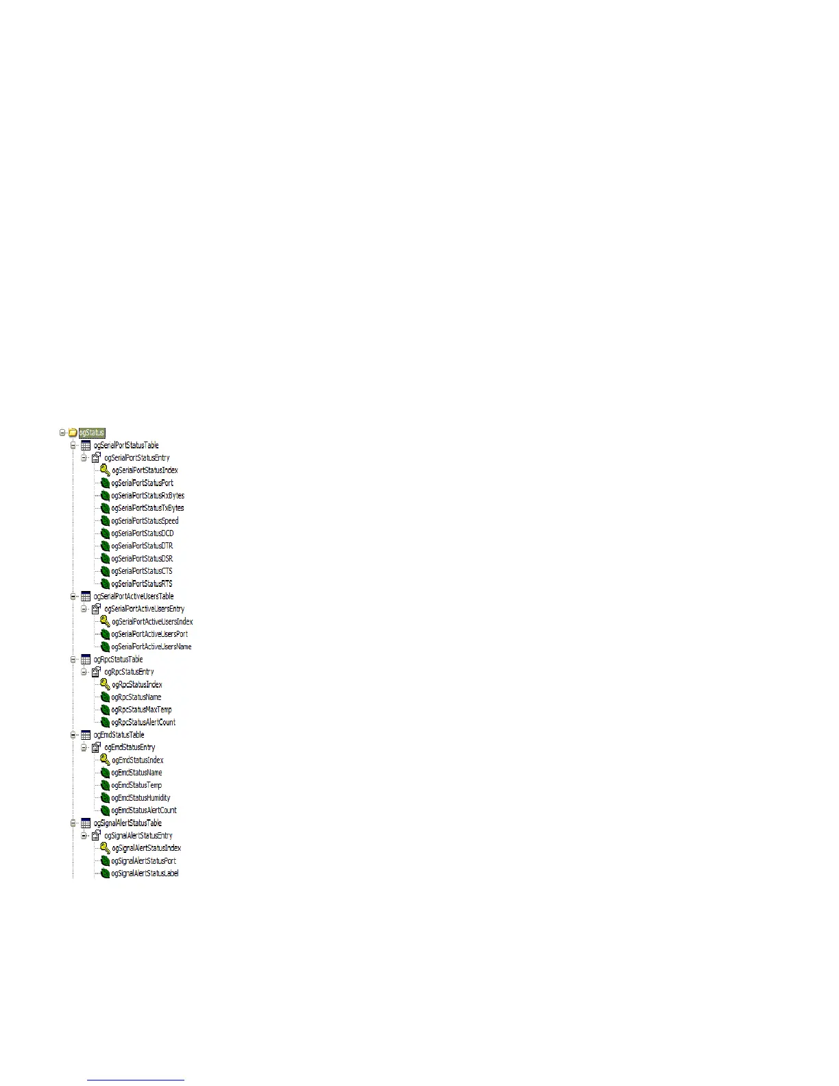 A mib browser may be used to explore the Black Box enterprise MIB structure. For example, the ogStatus tree is shown