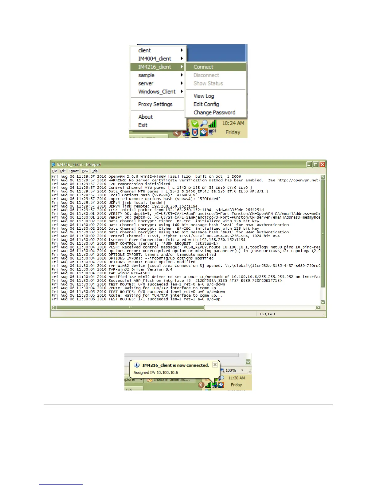 Once established, the OpenVPN icon will display a message notifying of the successful