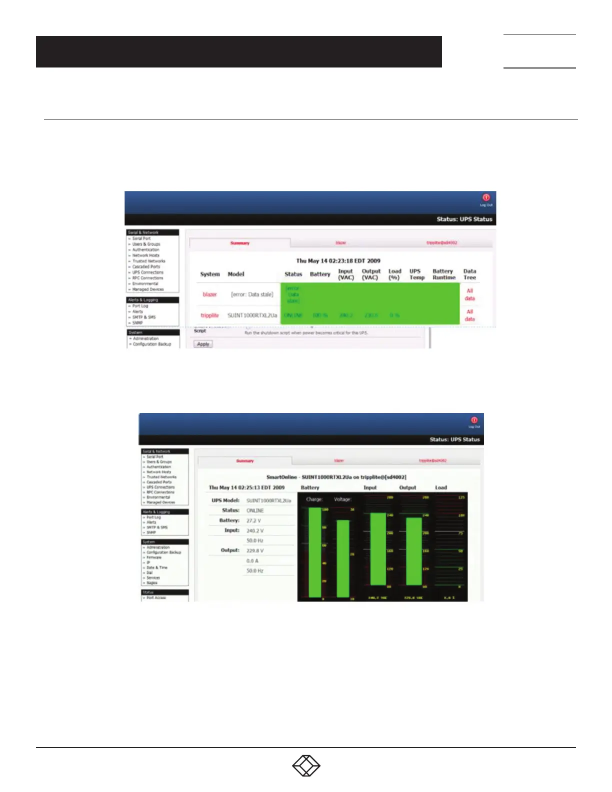 Click on any given UPS System’s All Data link in the table. Status and configuration information on the selected UPS System