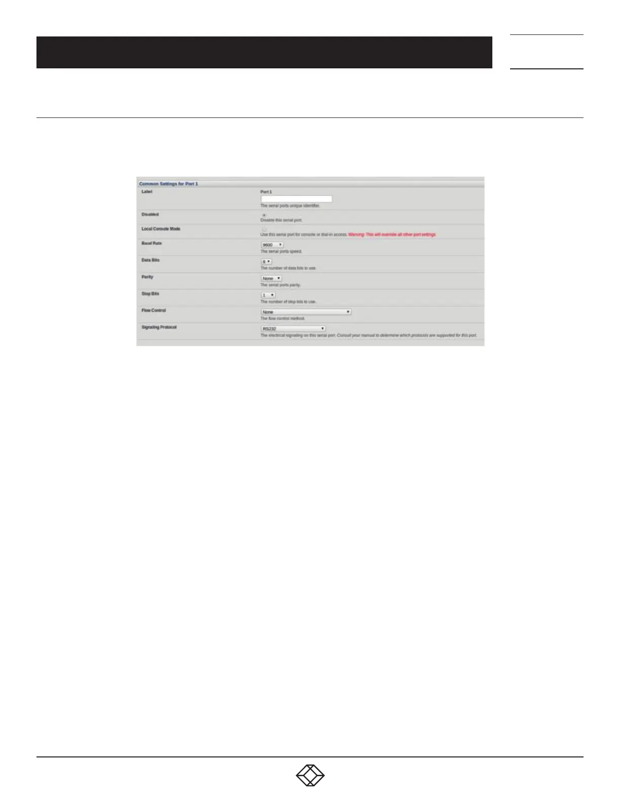 There are a number of common settings that can be set for each serial port. These are independent of the mode in which the port is