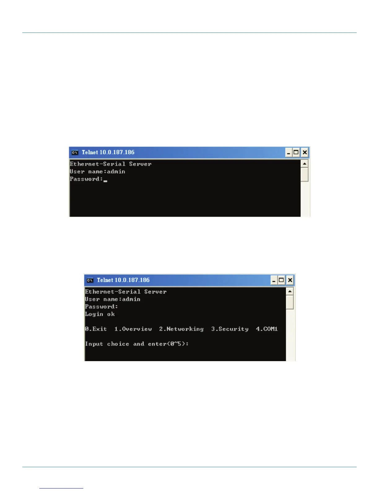 command prompt window). After you Telnet to LES301A, the system prompts for a password; the default password is blank.