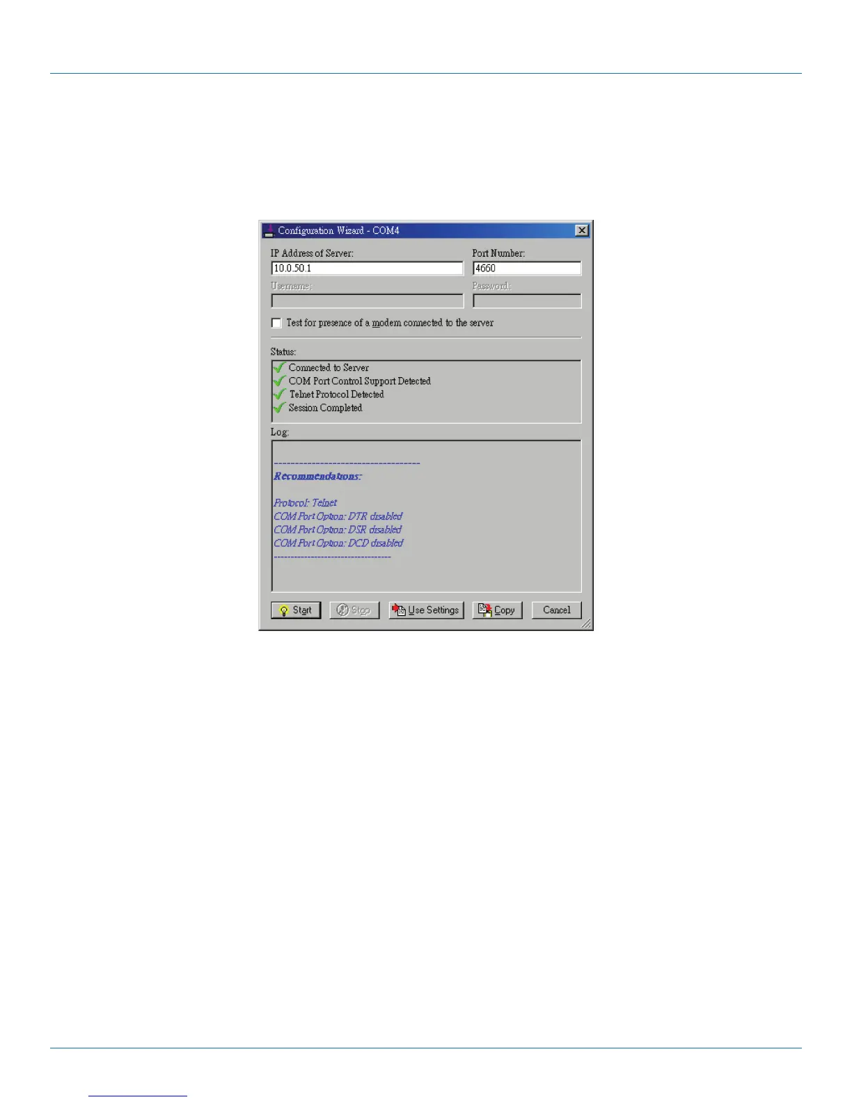 step verifies that the Virtual COMRedirector can communicate with the serial server using the settings you have provided. If the