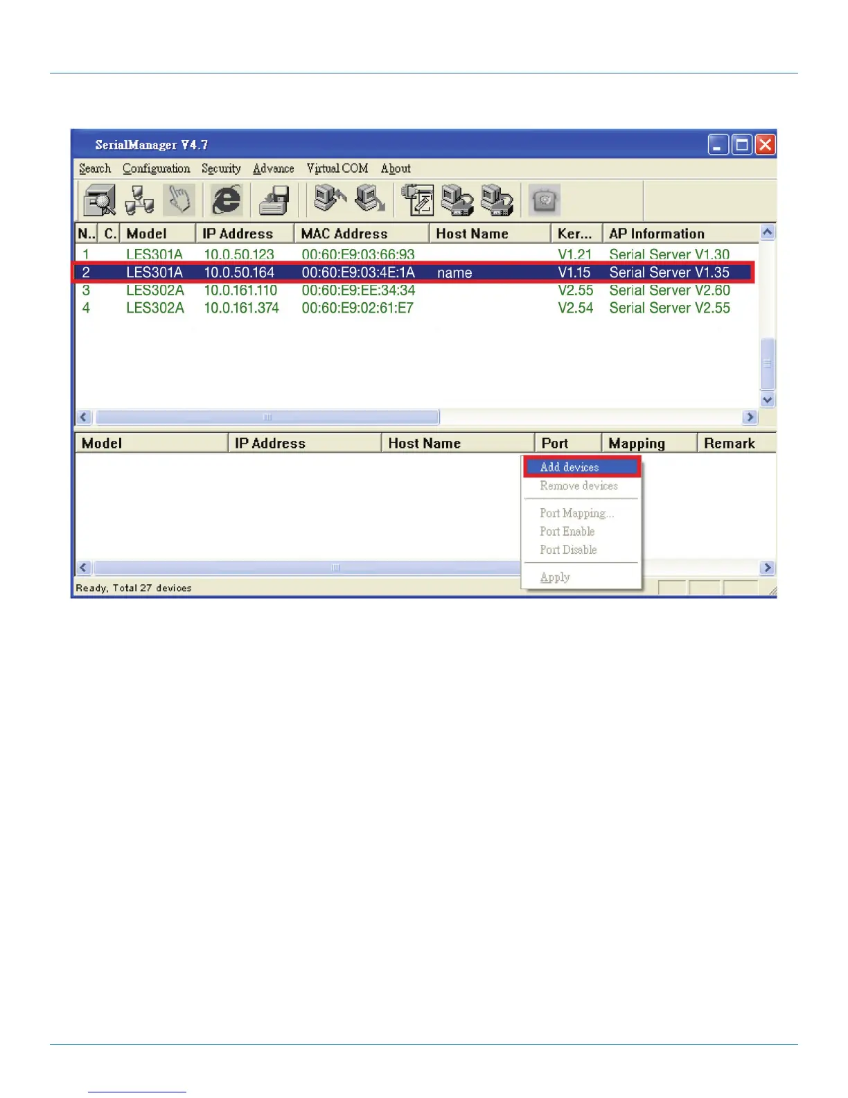 area by selecting “Remove devices.” You can disable Virtual COM for a specific port by selecting “Port Disable.” Remember to