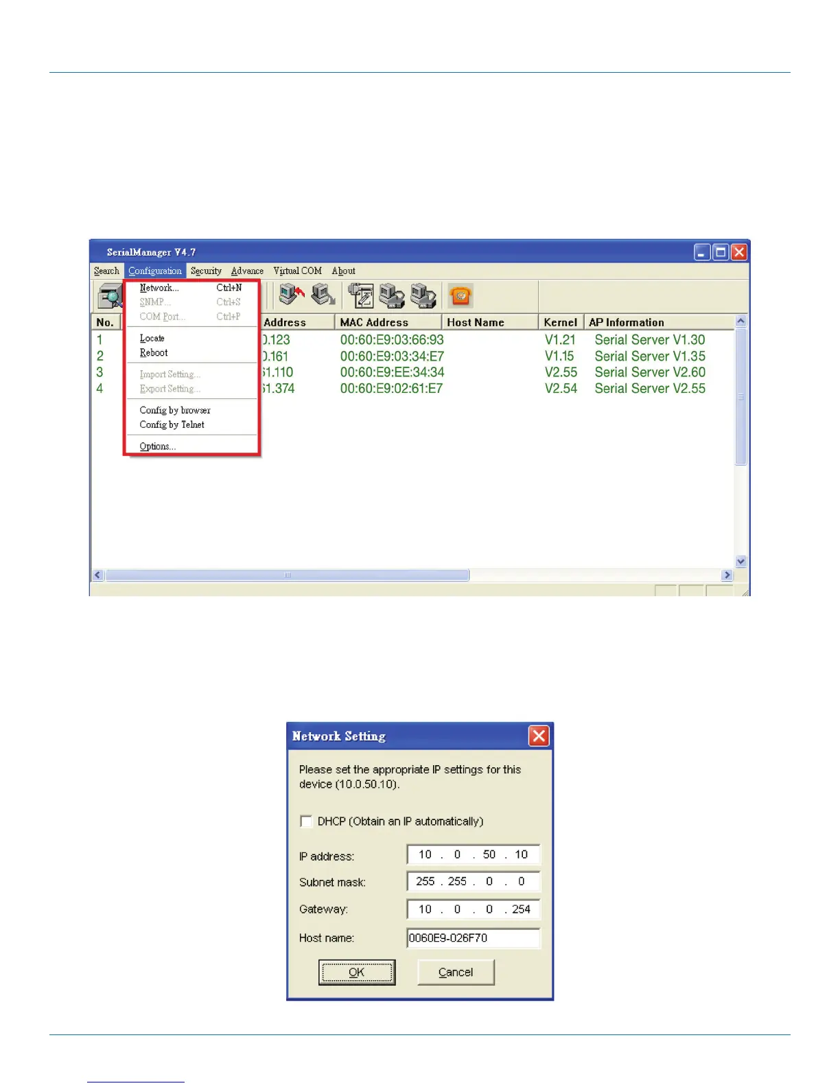 options. You can configure: “Network,” “SNMP,” “COM Port,” “Locate,” “Reset,” “Import Setting,” “Export Setting,” “Virtual