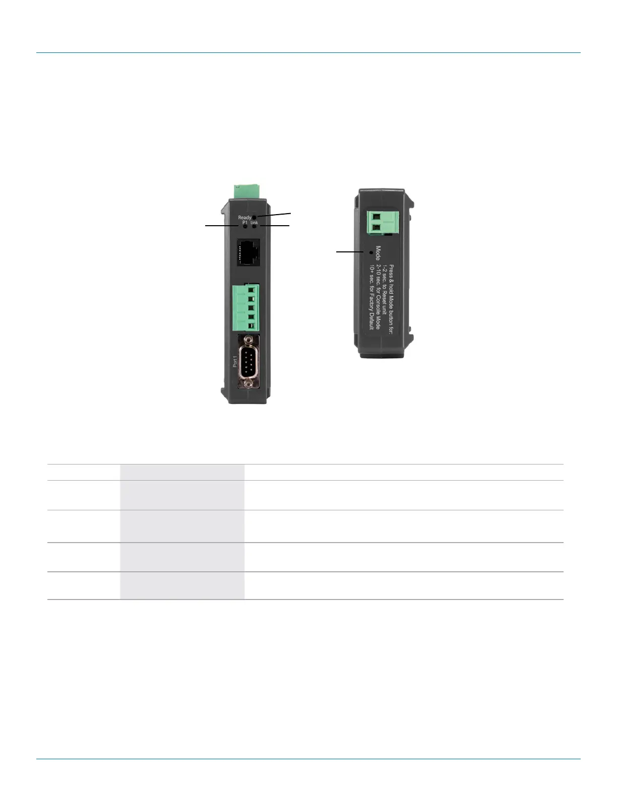 Hardened Serial Servers have LED indicators for Power, Serial Server Ready, Ethernet Speed and Link status, and Serial Port status.