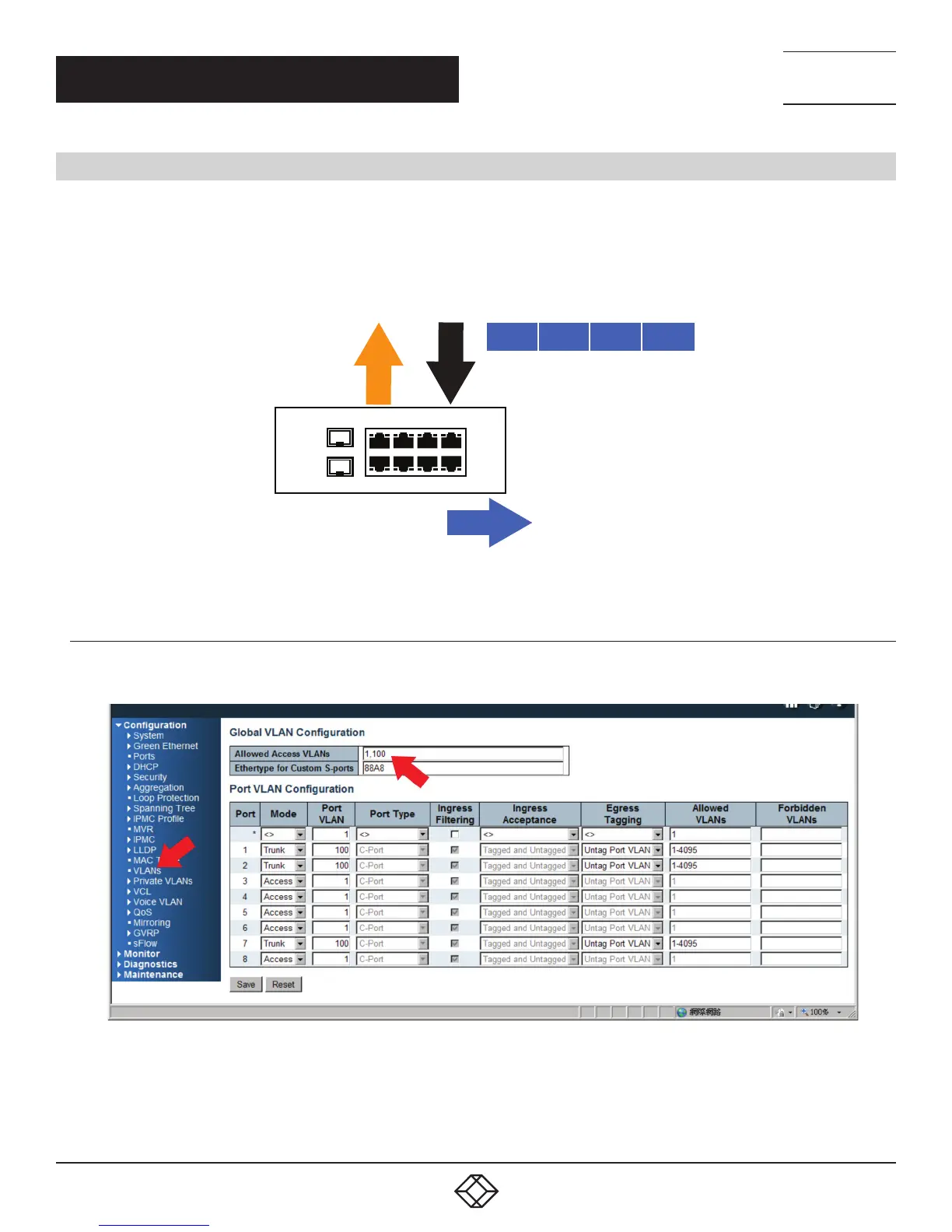 STEP 1: Go to Configuration -> VLANs -> Port VLAN configuration and configure PVID 100 on Port 1, Port 2 and Port 7.