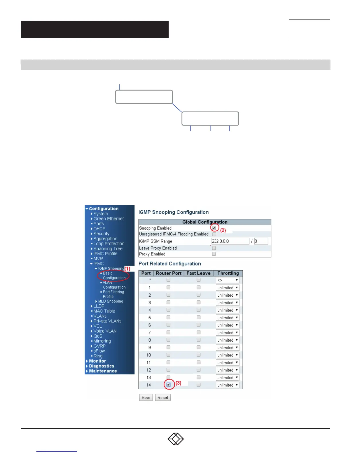 1. Go to “Configuration —> IPMC —> Basic Configuration” to select the “Snooping Enable” check box.