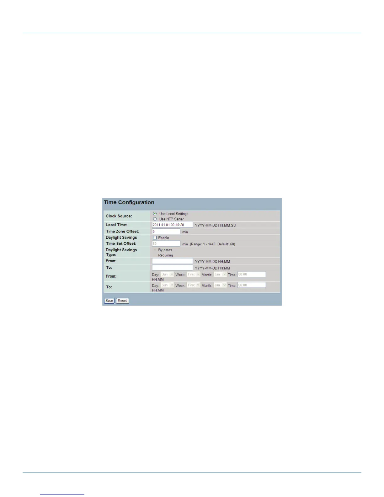 The switch provides manual and automatic ways to set the system time via NTP. Manual setting is simple. Input “Year”, “Month”,