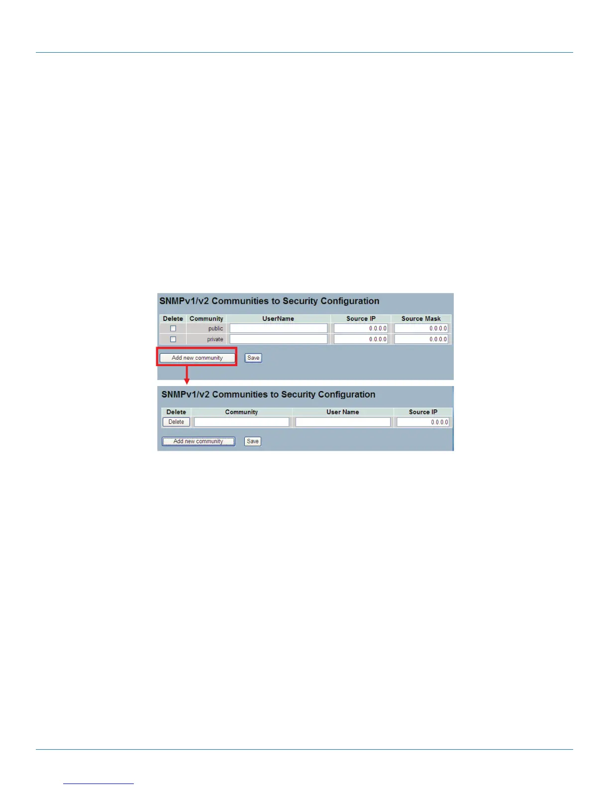 Figure 2-14. The SNMPv1/v2 Communities to Security Configuration screen.