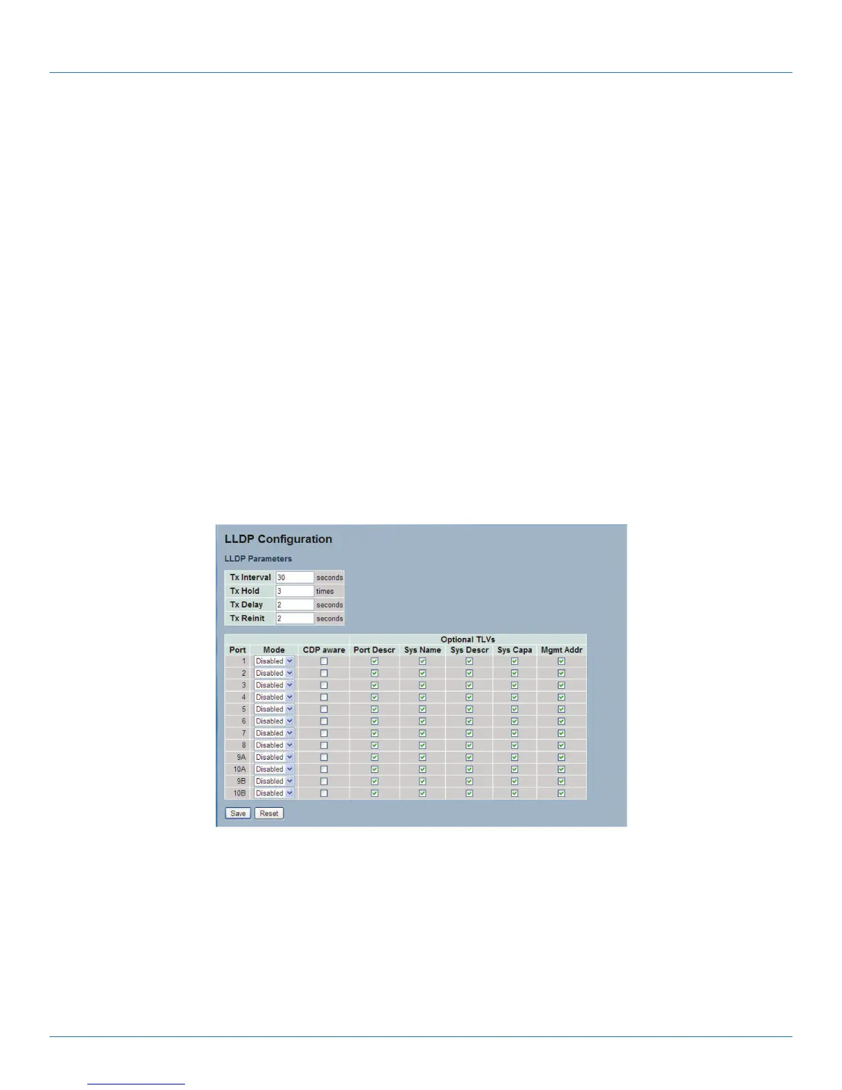 • Tx Interval: The switch periodically transmits LLDP frames to its neighbors for having the network discovery information up-to-