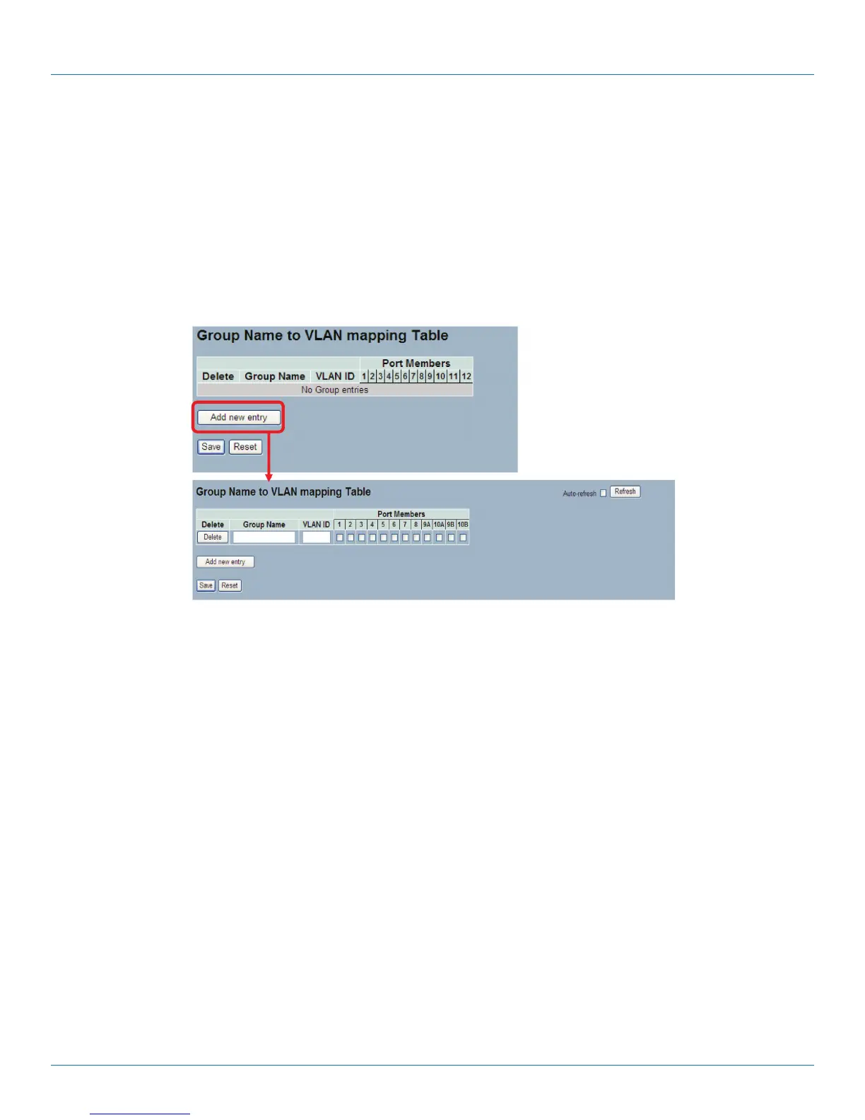 • Adding a New Group to VLAN mapping entry: Click to add a new entry in mapping table. An empty row is added to the