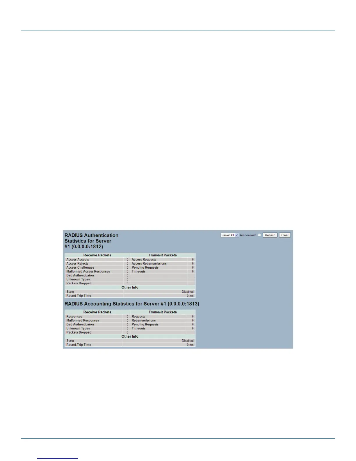 • Icons, upper right of screen (Refresh, Clear): Click to refresh the RADIUS Statistics information manually; click Clear to clear