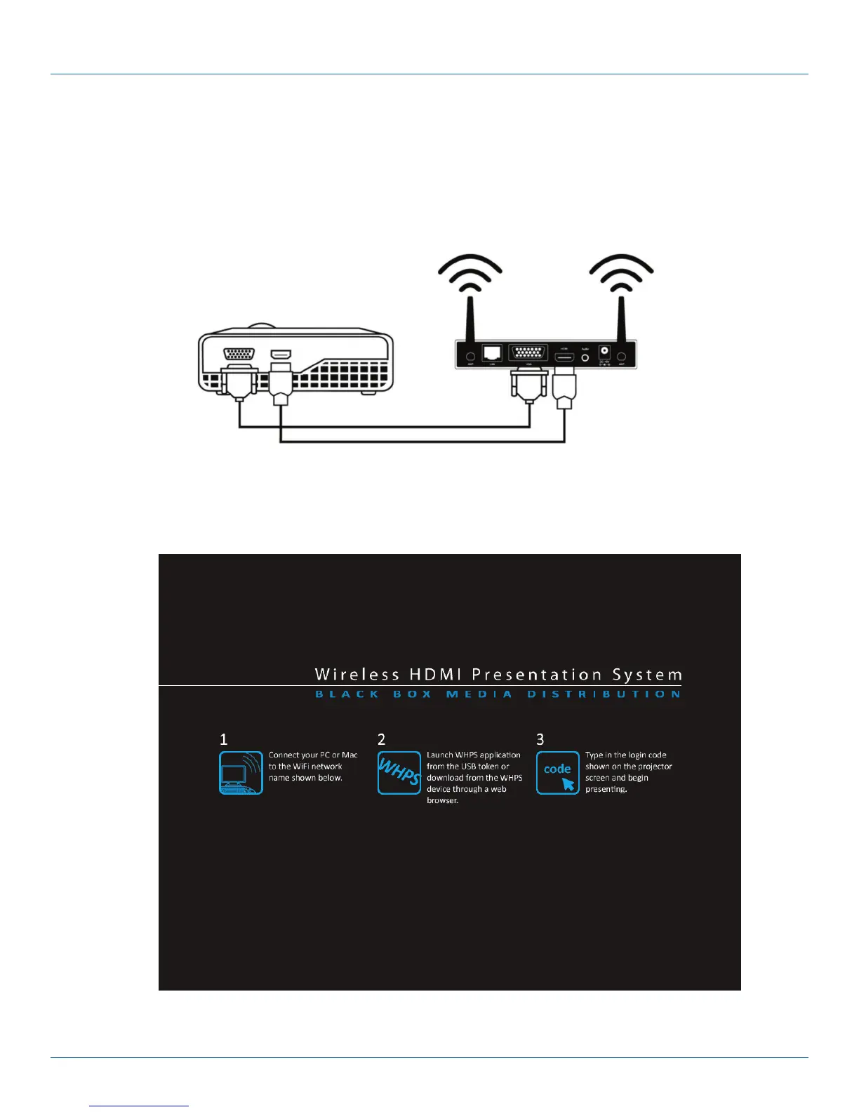 Step 1: Connect the projector VGA/HDMI cable to the Wireless HDMI Presentation System (WHPS) box VGA/HDMI connector
