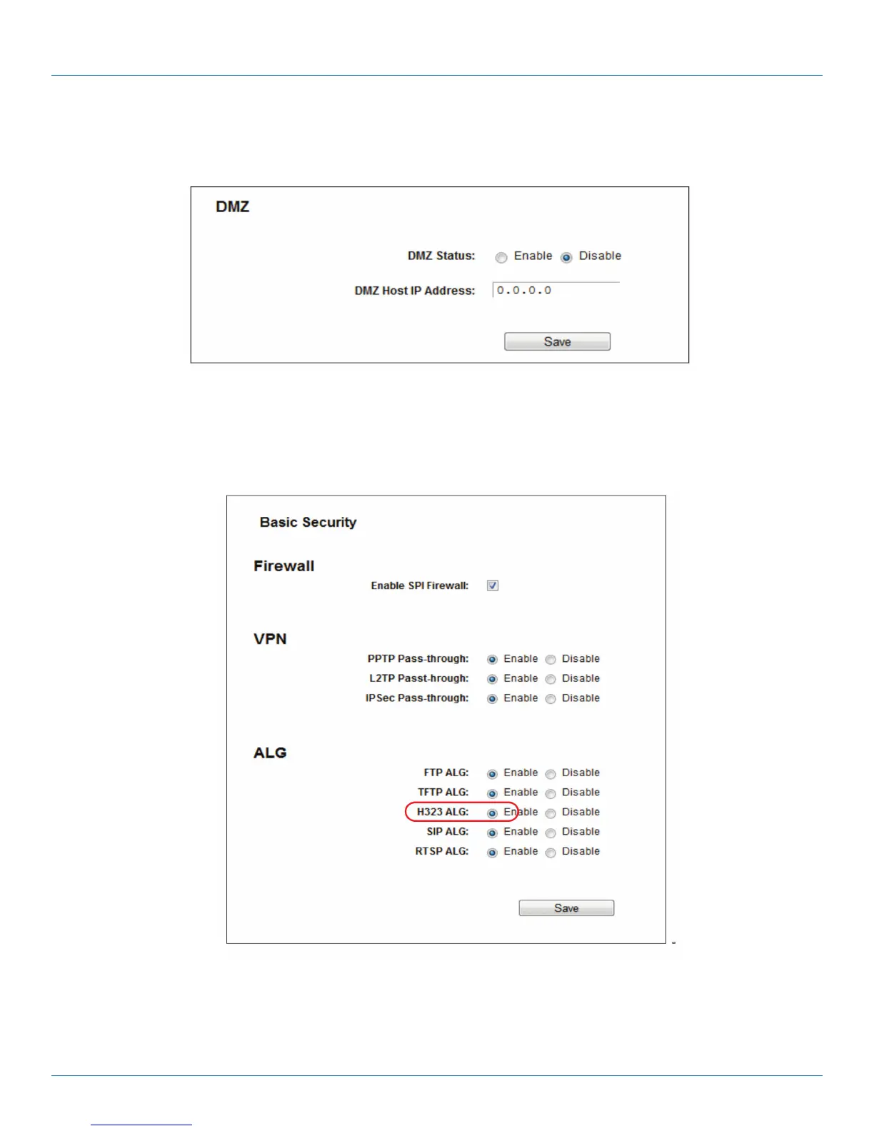 Security” submenu. On the “Basic Security” page, check the Enable radio button next to H323 ALG. Remember to click the