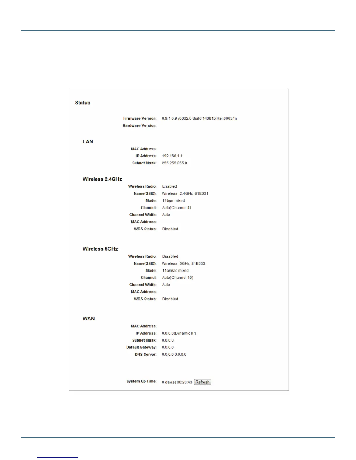 The Status page provides the current status information about the router. All information is read-only.