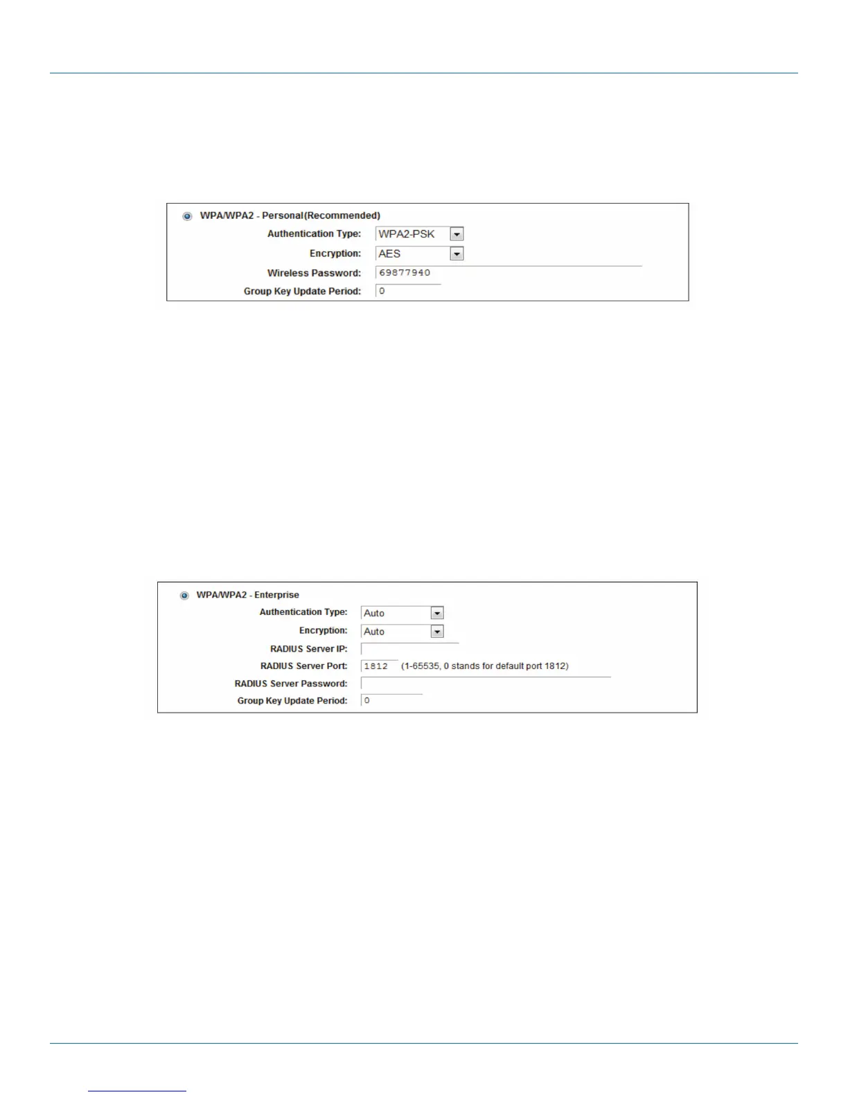 • WPA /WPA2—Enterprise—This is based on the Radius Server.
